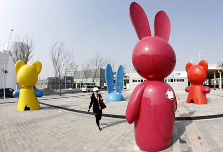 一名行人从园区入口广场的卡通雕塑旁经过