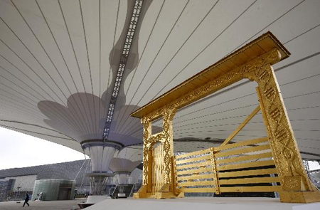 4月7日,世博志愿者纪念雕塑已经安放在世博主题馆前